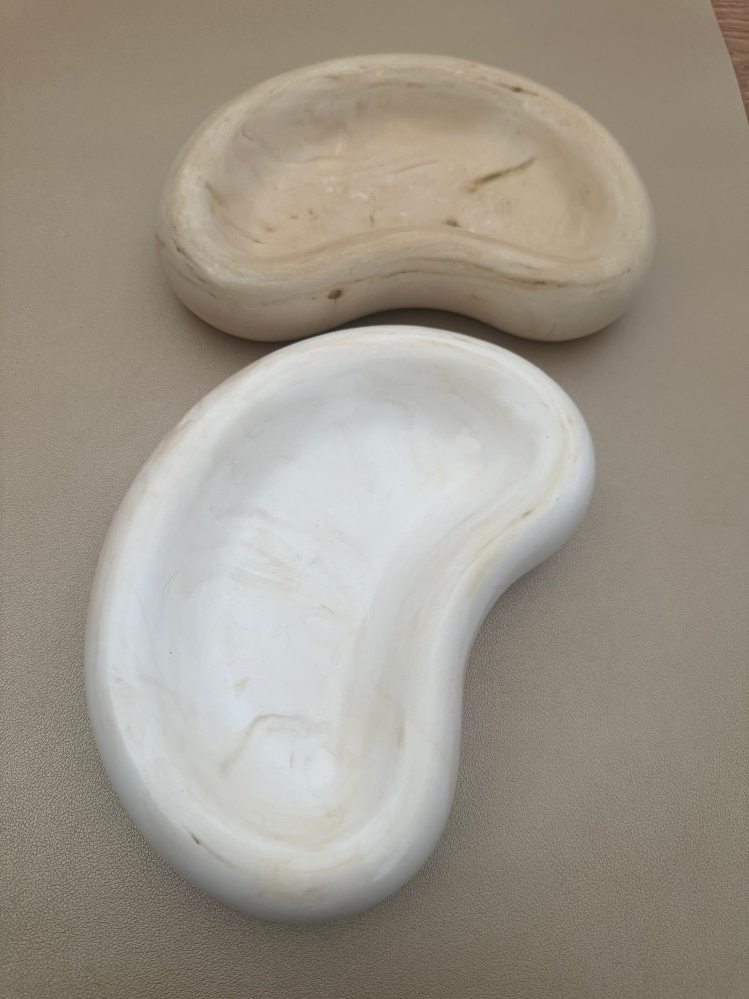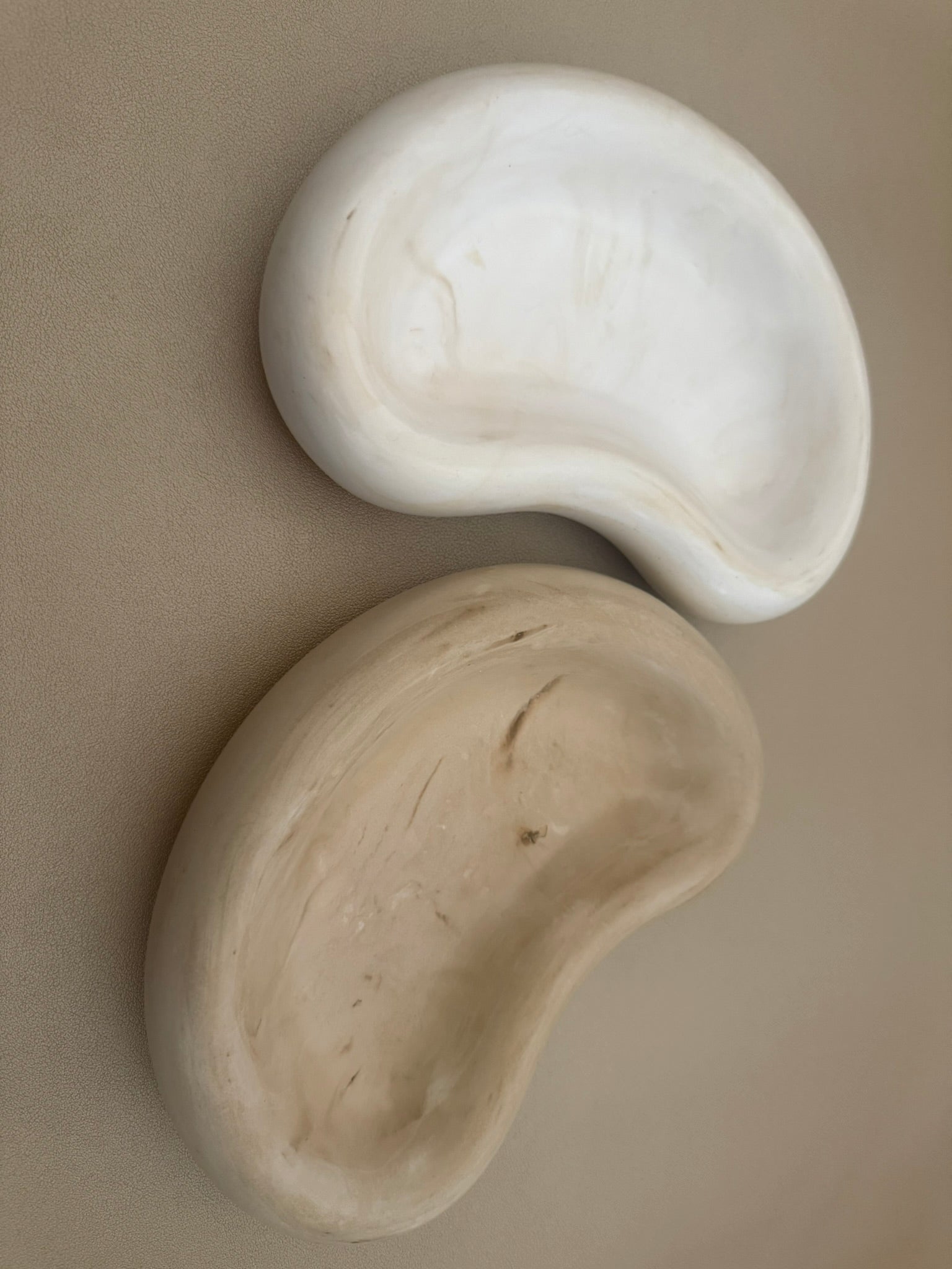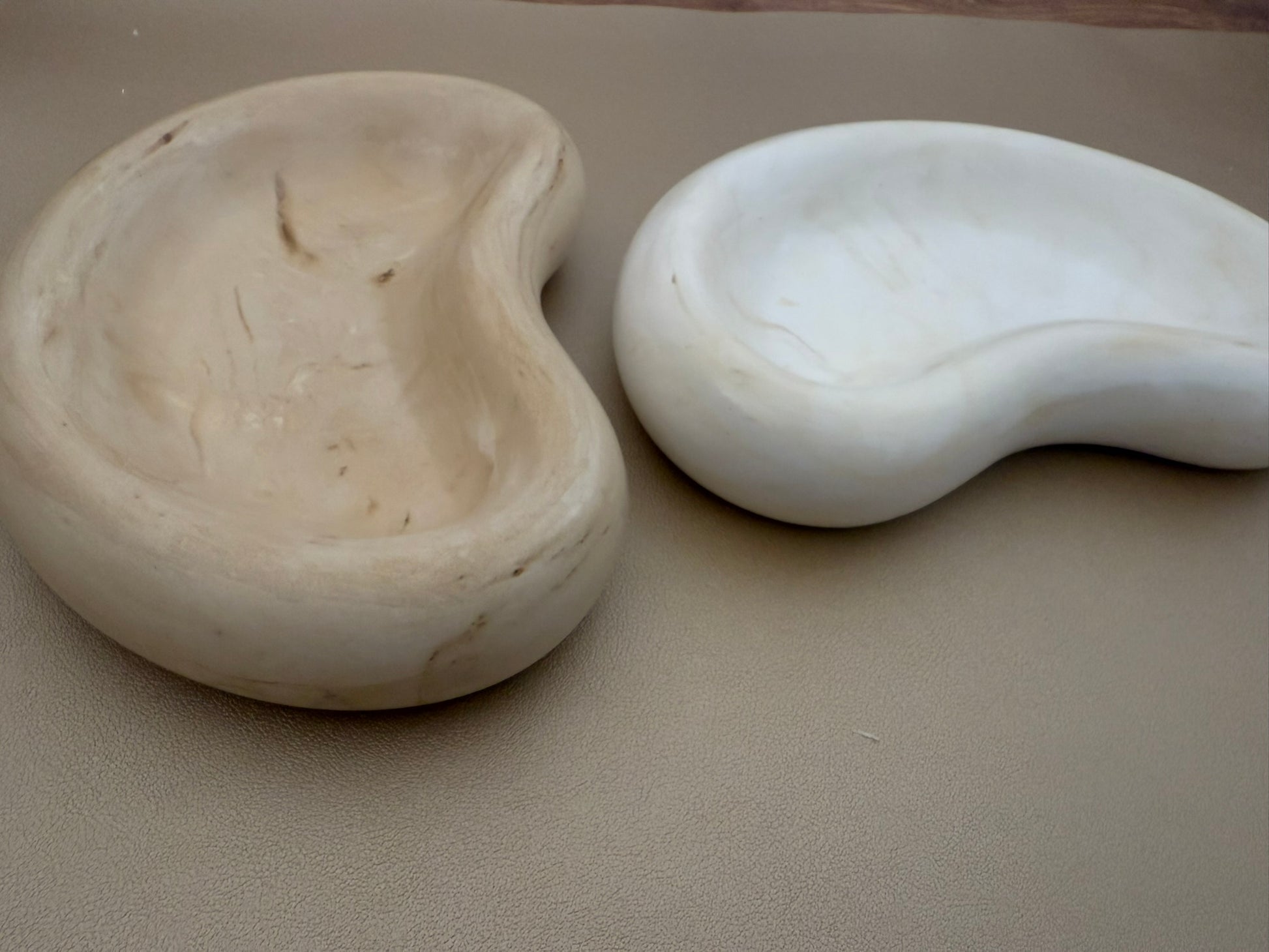 A pair of organically shaped trinket/soap dishes in soft beige and white stone finishes. With smooth, kidney-like curves and a minimalist design, they bring a calm, sculptural elegance to everyday rituals.
