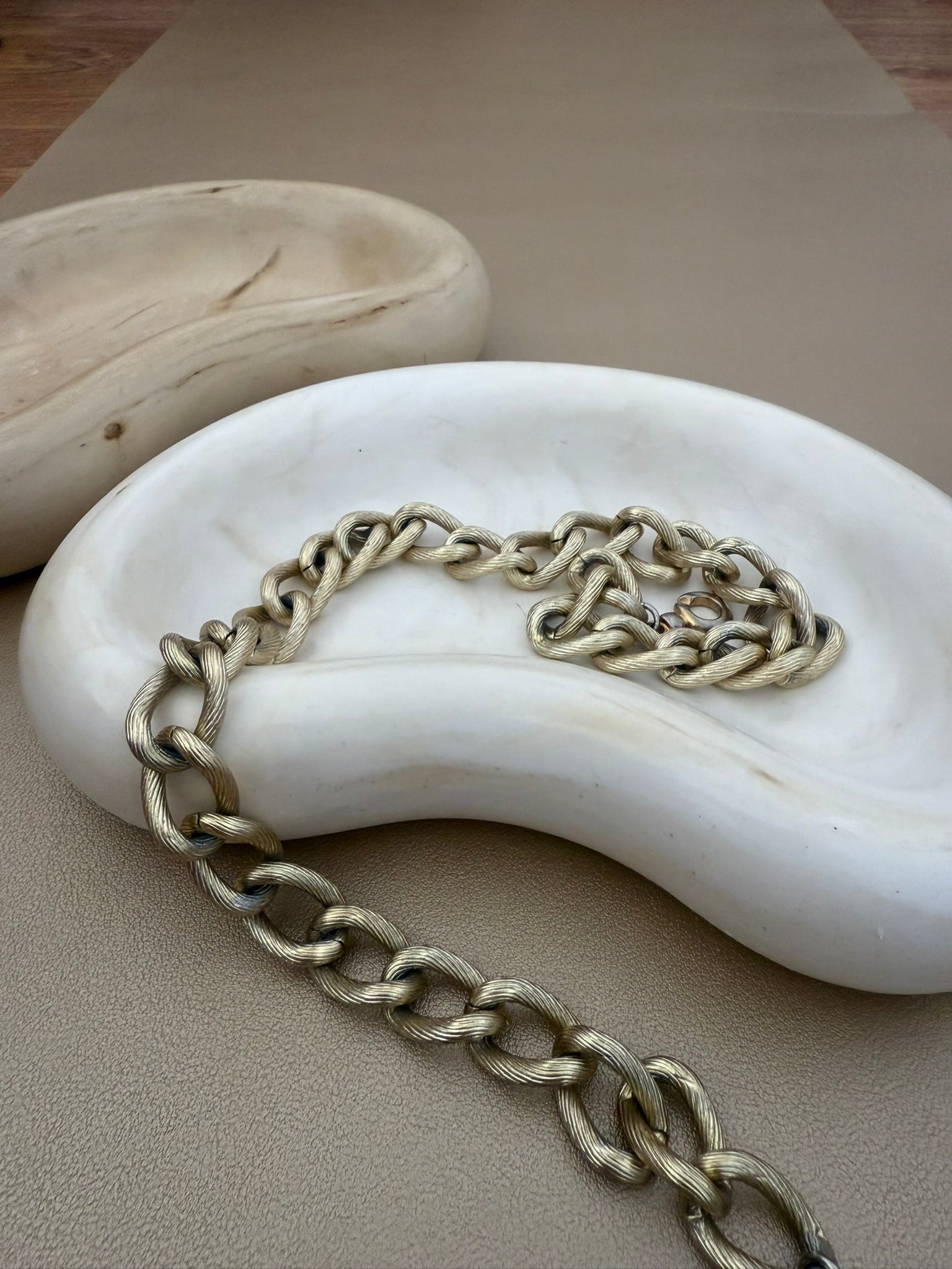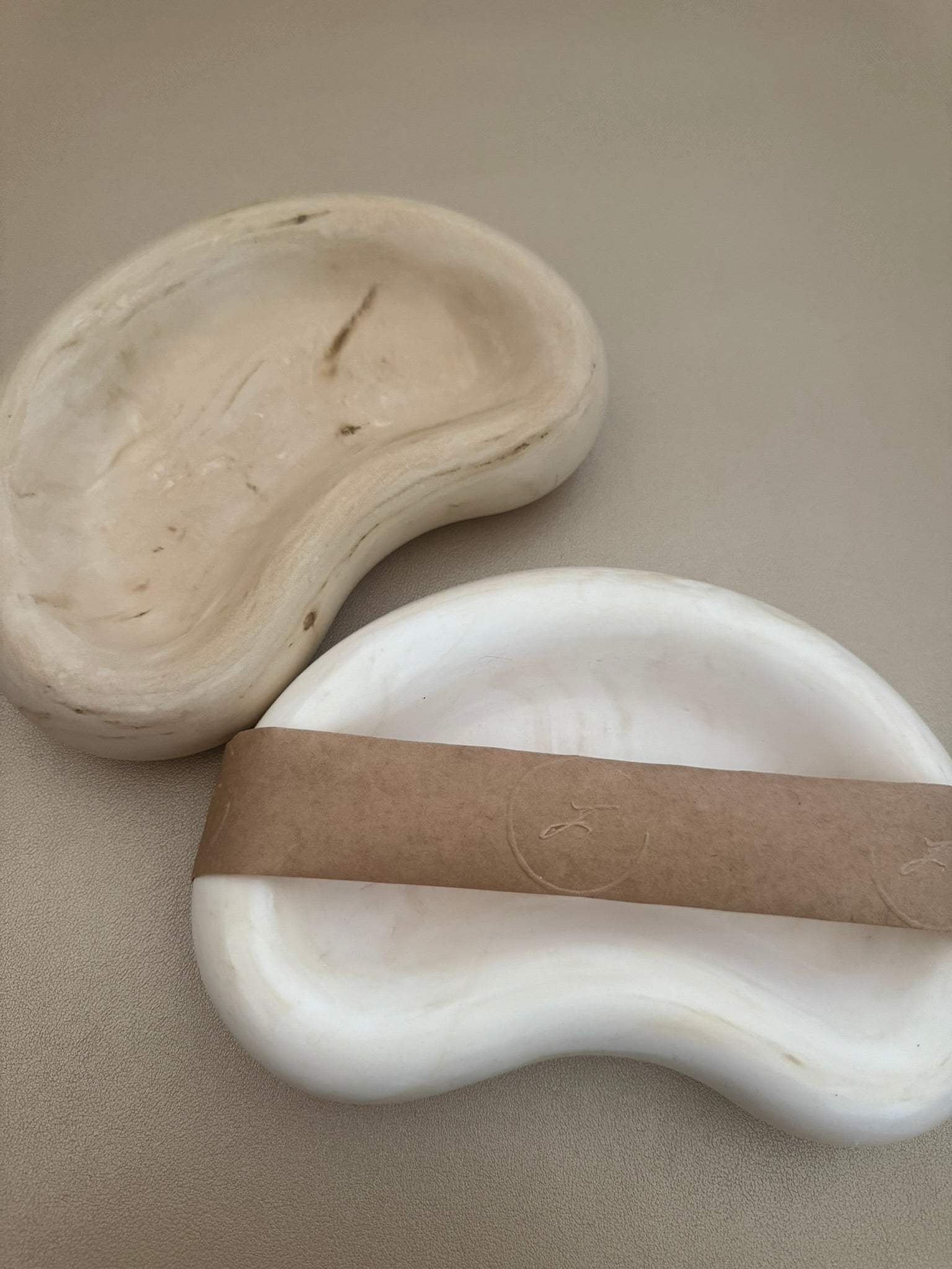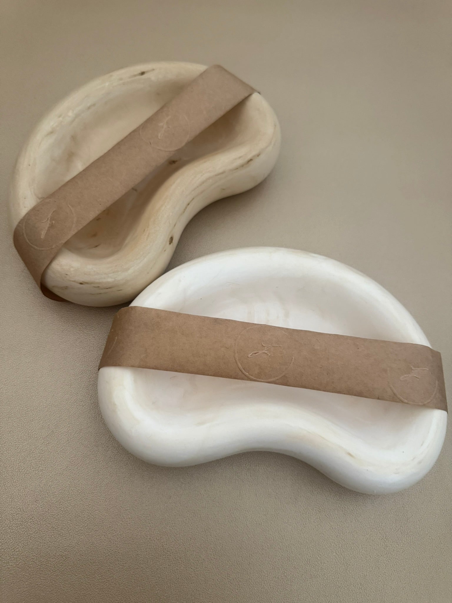 A pair of organically shaped trinket/soap dishes in soft beige and white stone finishes. With smooth, kidney-like curves and a minimalist design, they bring a calm, sculptural elegance to everyday rituals.