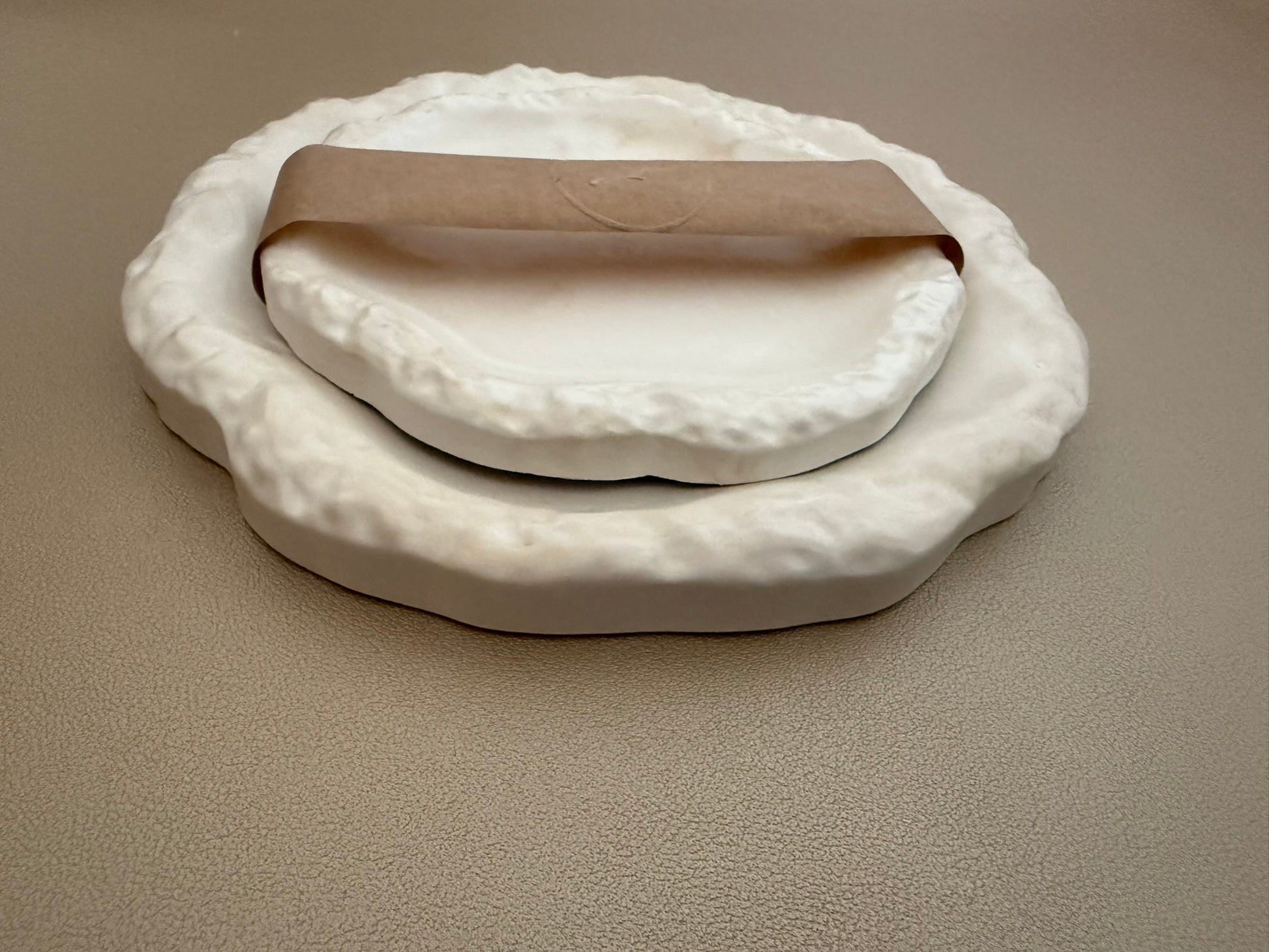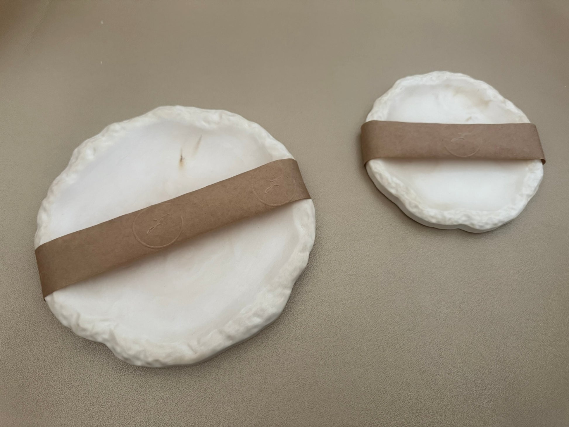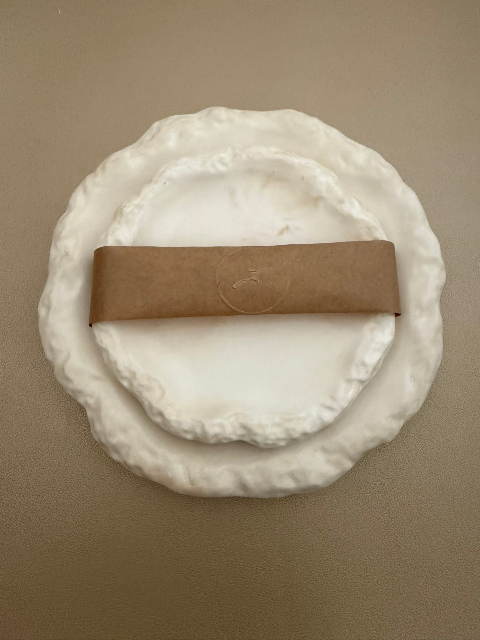 A pair of round trays in a soft off white stone finish, each with irregular, hand-sculpted edges. Their minimalist form and raw contours evoke a quiet, organic elegance, perfect as home decor accents or functional art pieces.